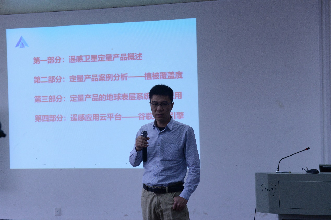 占玉林博士首先简要介绍了遥感定量产品的定义、产品体系,并结合实例从文献调研、实验分析、算法改进、模块开发等多个方面详细介绍了遥感定量产品反演的技术流程;然后介绍了遥感定量产品在地球表层系统科学领域的应用案例;最后给大家介绍了遥感定量产品研究与生产云平台—谷歌地球引擎。报告深入浅出,用日常生活中的例子将原本专业化的遥感卫星定量化产品技术讲解得通俗易懂、生动有趣。报告在师生们热烈的掌声中结束。